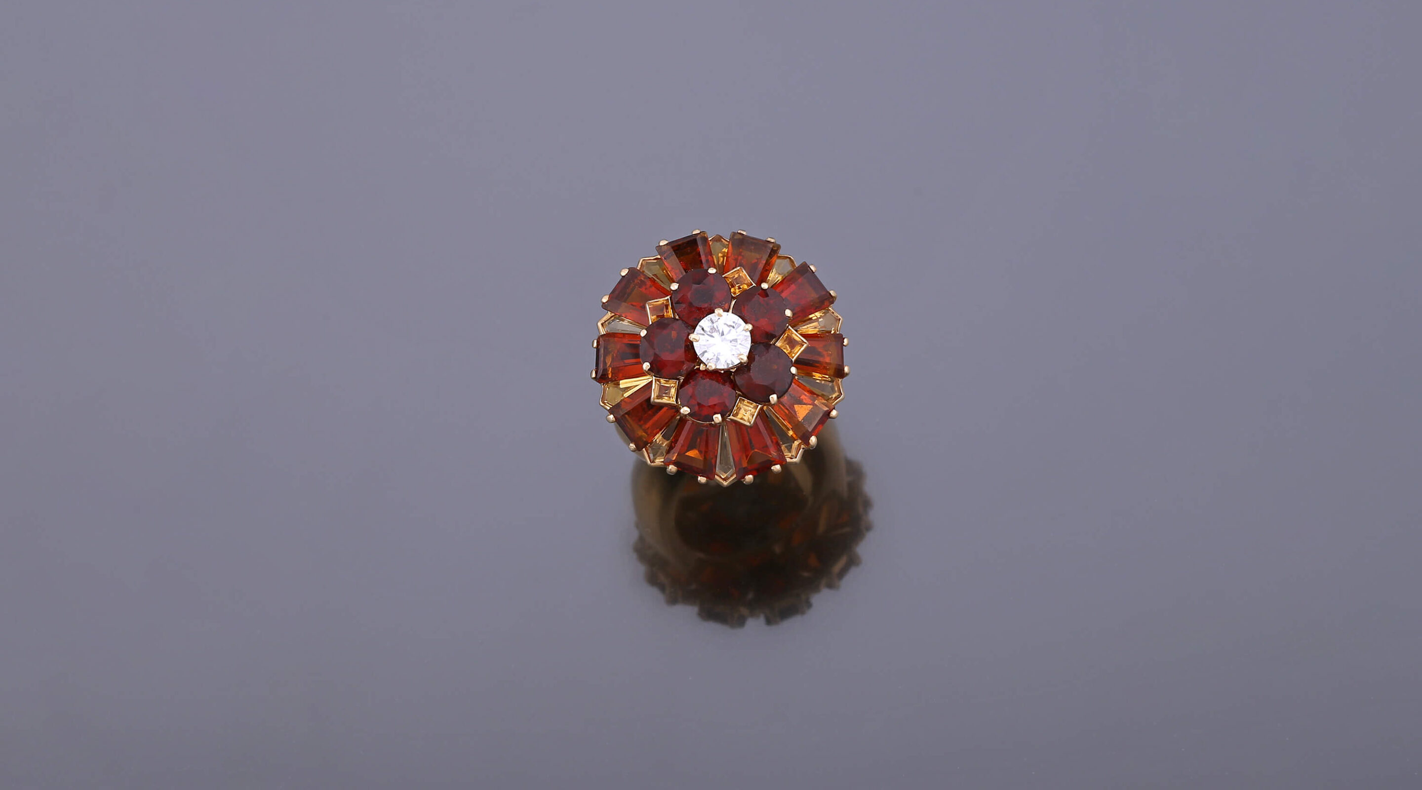 A gold entourage ring set with two colours of citrine and diamond, made in the 1940s.
