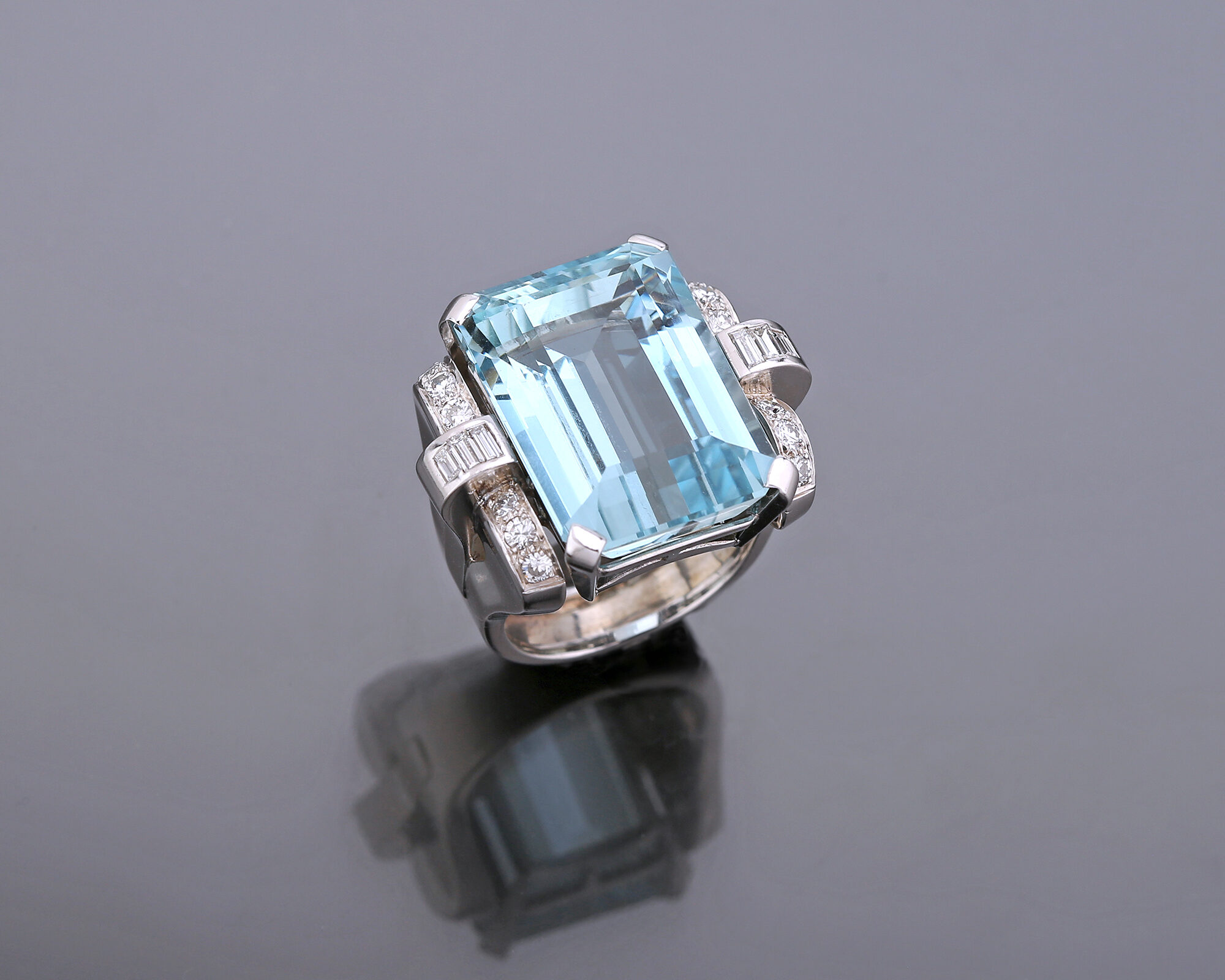 Een sculpturale Art Deco ring gemaakt rond 1940 van witgoud en bezet met een aquamarijn van c. 33 karaat.